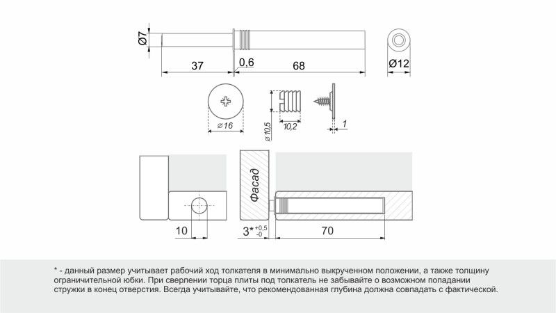 Сильная пружина толкателя позволяет выталкивать даже тяжелые и крупные фасады минимум на 37 мм.