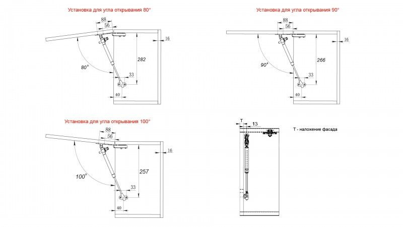 Газовый лифт поставляется в комплекте с шаблоном-инструкцией для установки, которая поможет легко и быстро произвести монтаж, а также и выбрать угол открывания фасада 80°, 90° или 100°.