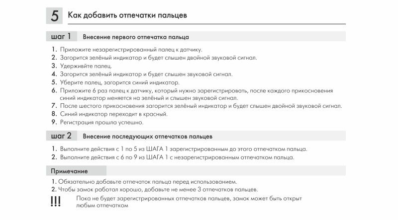 Модель обладает высокочувствительным быстро реагирующим биометрическим датчиком. К замку можно настроить до 20 отпечатков пальцев. До момента настройки замок может открыть любой отпечаток.