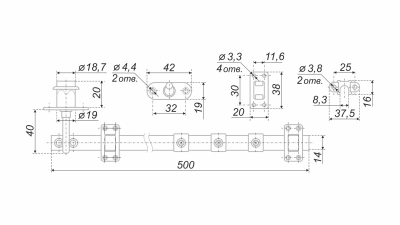 Комплектация: ключ – 2шт., центральное запорное устройство – 1шт., запорный блок – 3шт., ответная планка – 3шт., планка крепления замка – 2шт., декоративная накладка на цилиндр – 1шт.