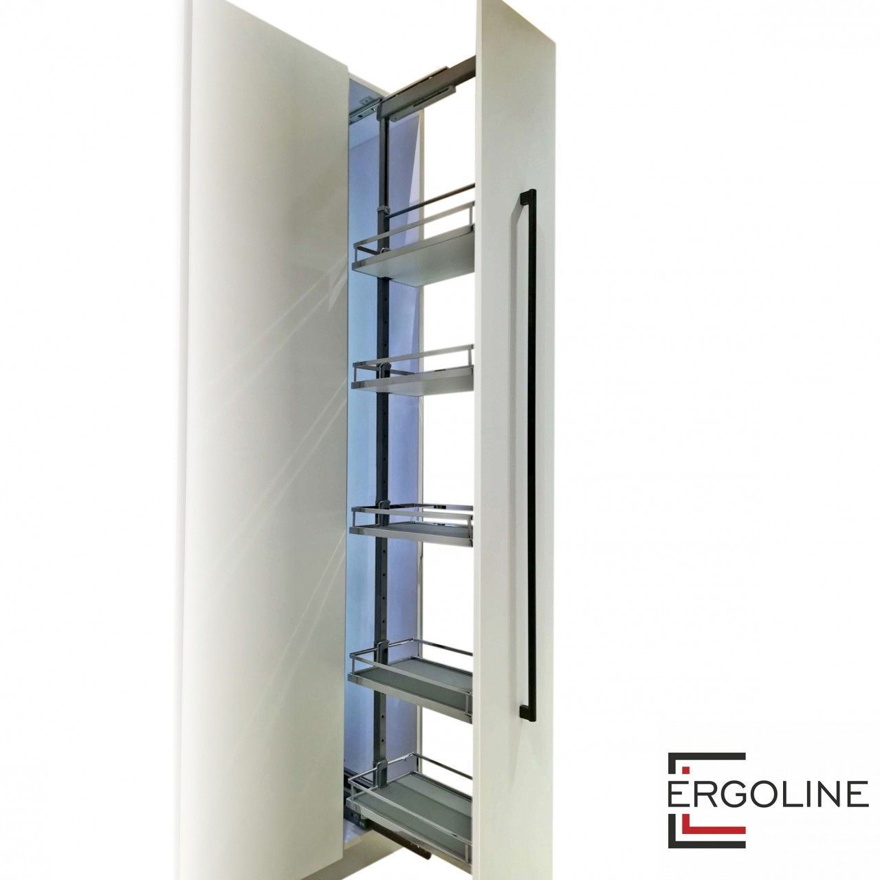 Модель комплектуется современными усиленными нижними и стабилизирующими верхними направляющими механизмами с опцией полного выдвижения и амортизацией для легкой и комфортной эксплуатации. Колонна движется плавно и стабильно даже при полной нагрузке полок.