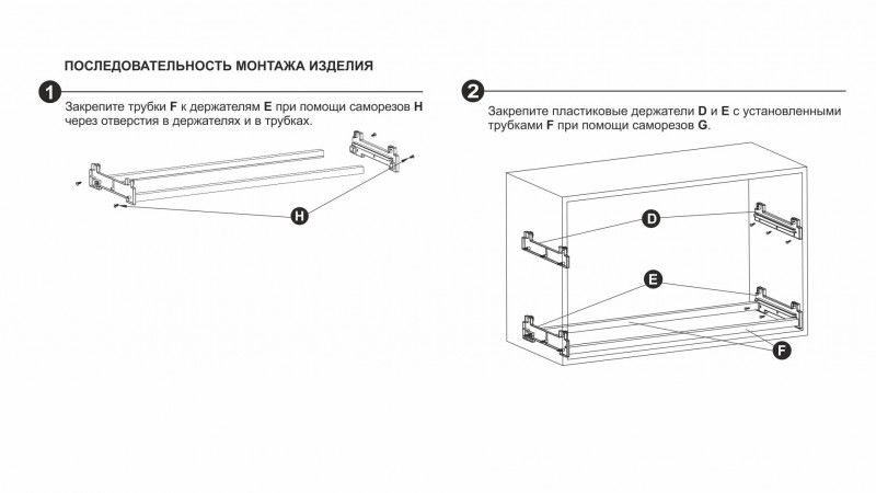 В комплект входит: 2 уровня сушки (решётка для кружек и L-образная решётка для тарелок), 2 пластиковых поддона, 2 комплекта пластиковых держателей нижнего и верхнего уровня, 2 соединительных трубки, саморезы M4x20 – 10 штук, 3,5х8 – 4 штуки.