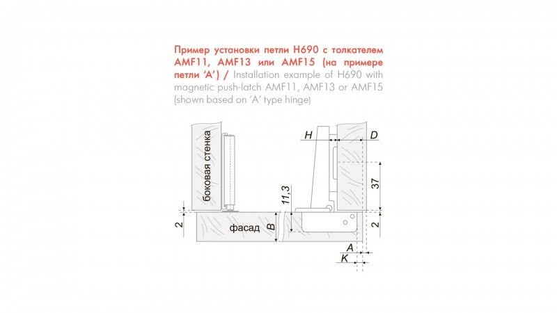 Фасад фиксируется в закрытом положении при помощи соединения стальной ответной планки, которая крепится на фасад, и магнита, расположенного на толкателе AMF. При нажатии на закрытый фасад, AMF срабатывает на открывание (выталкивание штока толкателя), что позволяет приоткрыть фасад на 1-3 см. Затем, за счет веса фасада, по инерции магнит отходит от ответной планки и обратная пружина петли открывает дверку полностью.