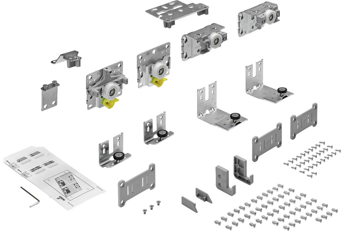 Состав комплекта: В комплект входят ходовые и направляющие элементы, а также комплект крепежа для шкафов с 2 дверями.